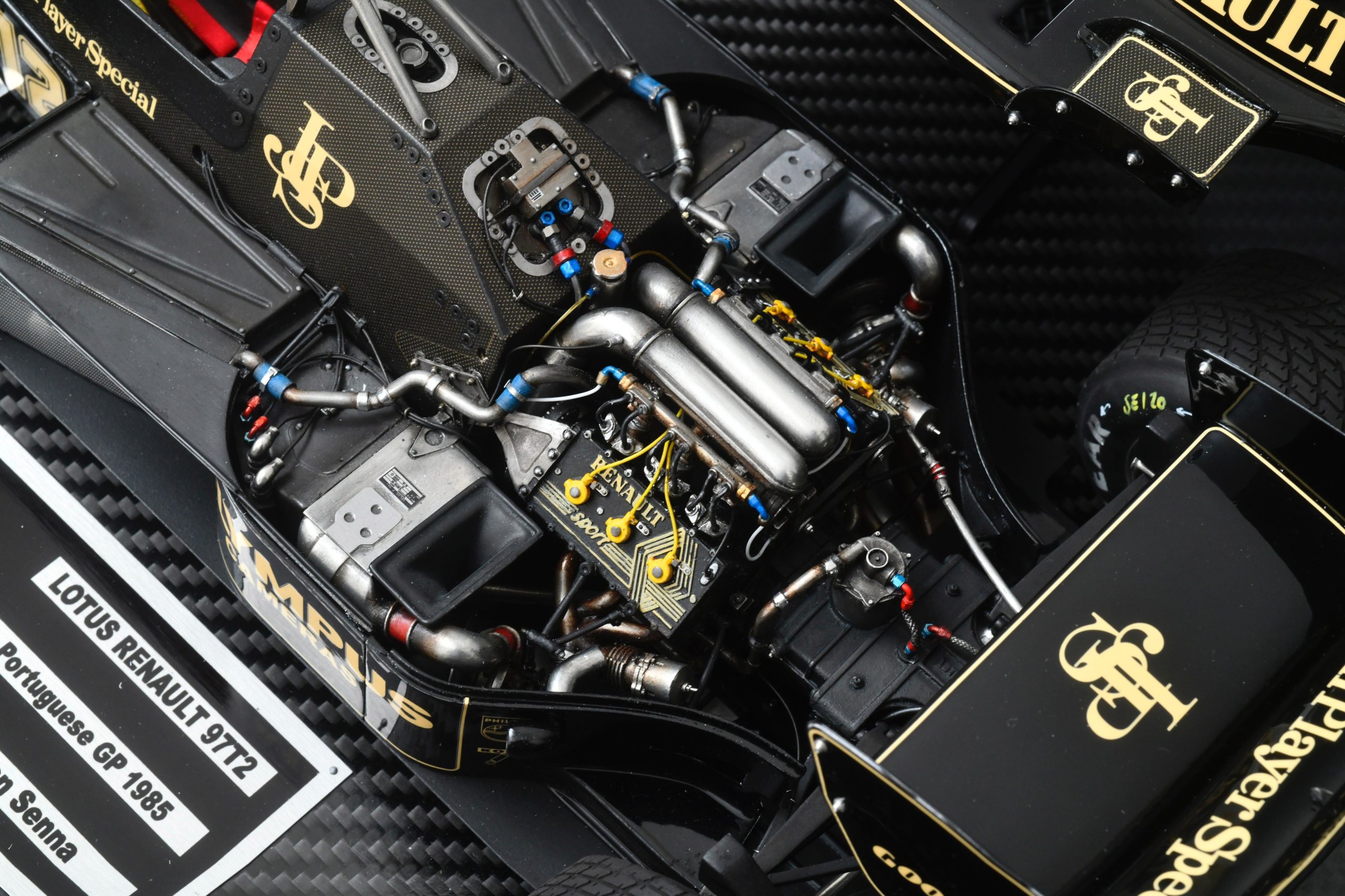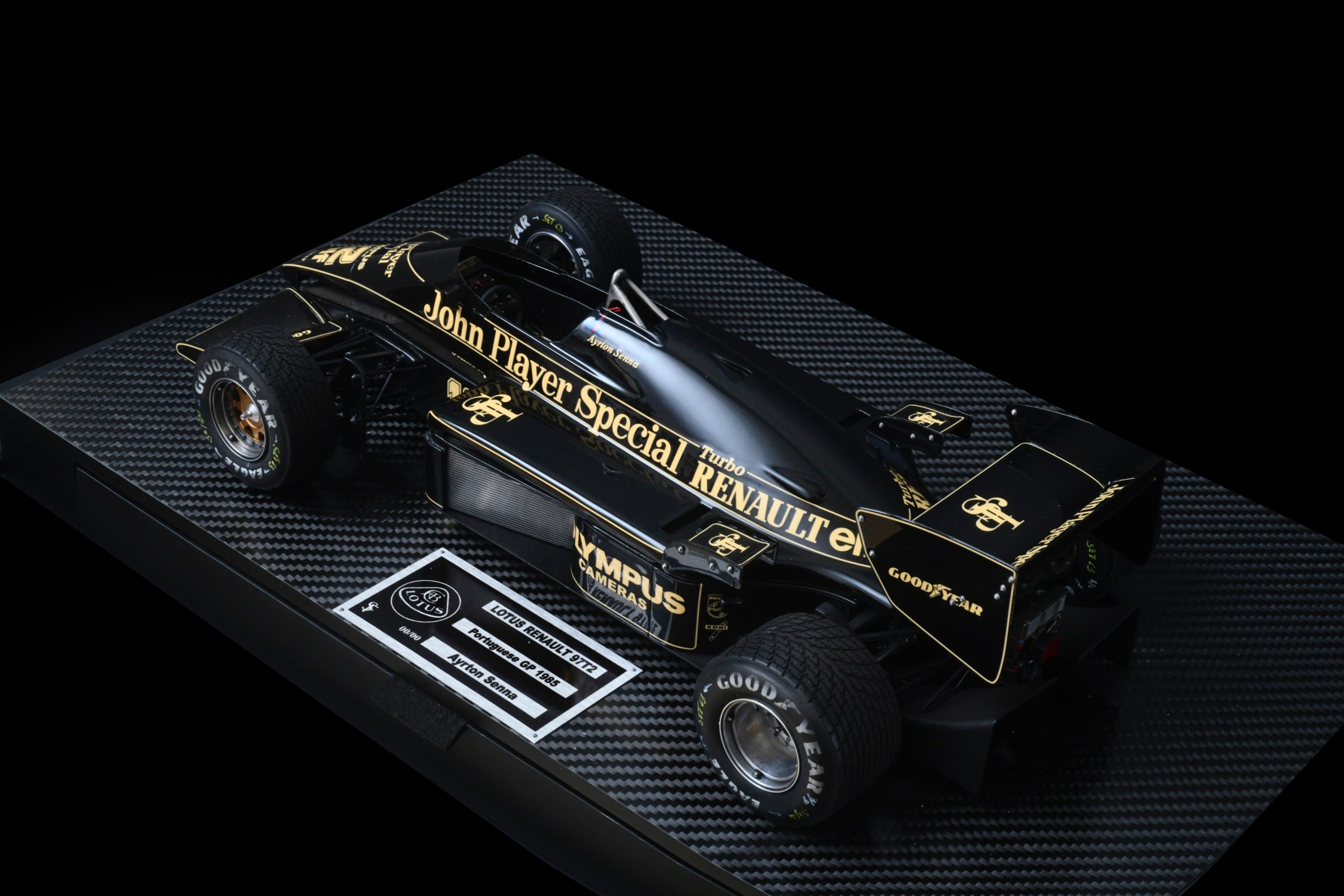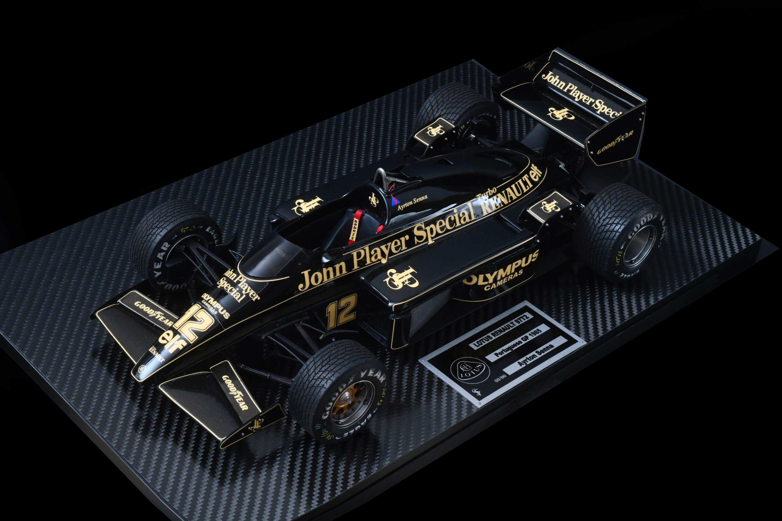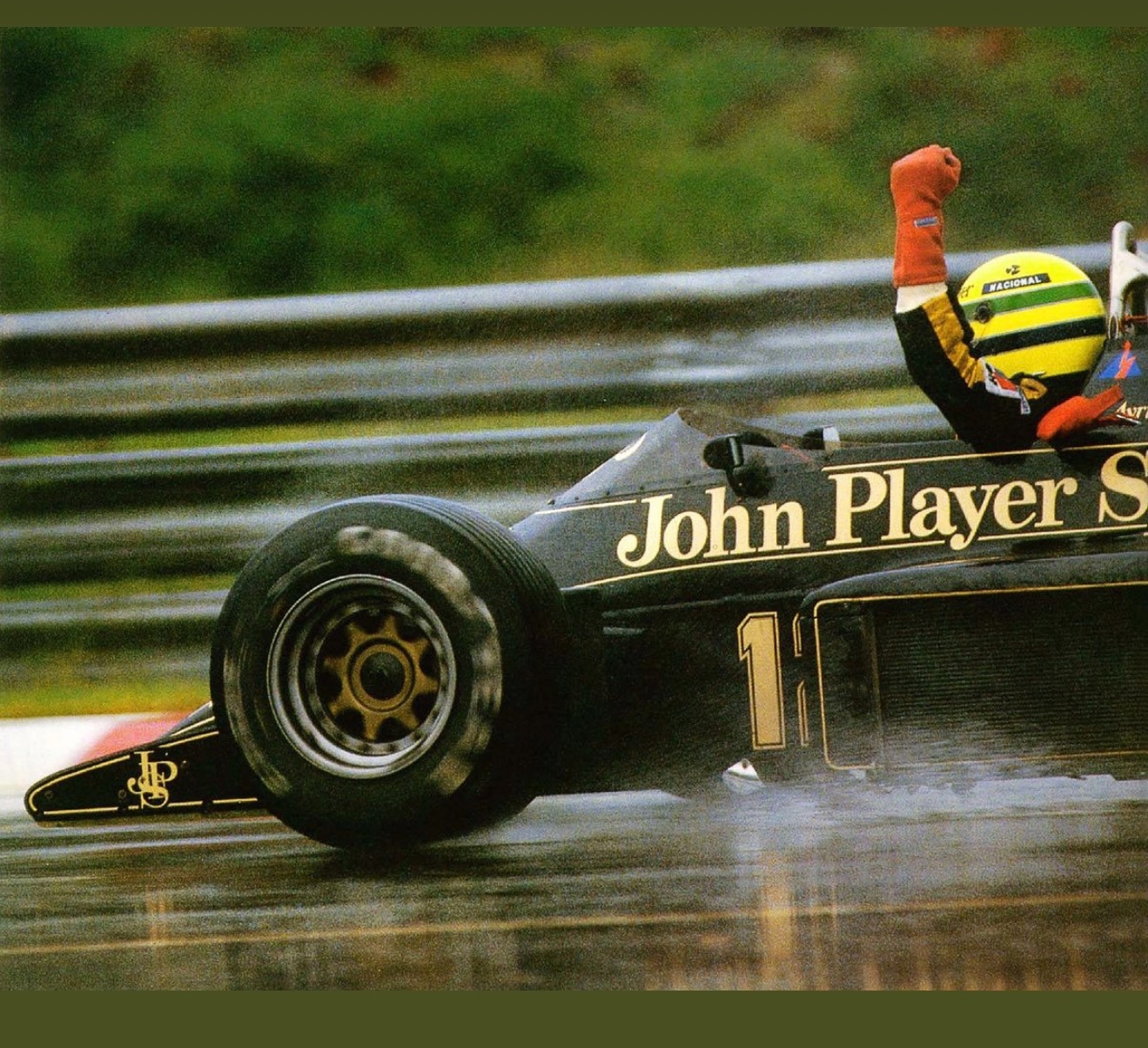 The 1985 season and is best remembered for delivering Ayrton Senna his first ever Grand Prix victory during a torrential downpour at the Portuguese Grand Prix in Estoril. This black and gold John Player Special liveried machine was powered by a 1.5 liter turbocharged Renault V6 engine that produced over 800 horsepower and featured innovative aerodynamic elements like mini winglets on the sidepods to improve stability and downforce. During the historic 1985 Portuguese Grand Prix Senna started from his maiden pole position and demonstrated unparalleled mastery in the wet conditions by leading every single lap and finishing more than a minute ahead of second place Michele Alboreto while lapping nearly the entire field. The car was widely considered to have the best handling chassis of the season due to its exceptional braking and turning capabilities which allowed Senna to maintain a dominant pace even as other top drivers spun out of the race. This victory at Estoril remains one of the most iconic performances in motorsport history and marked the true arrival of Ayrton Senna as a global sporting icon and the undisputed master of wet weather driving.