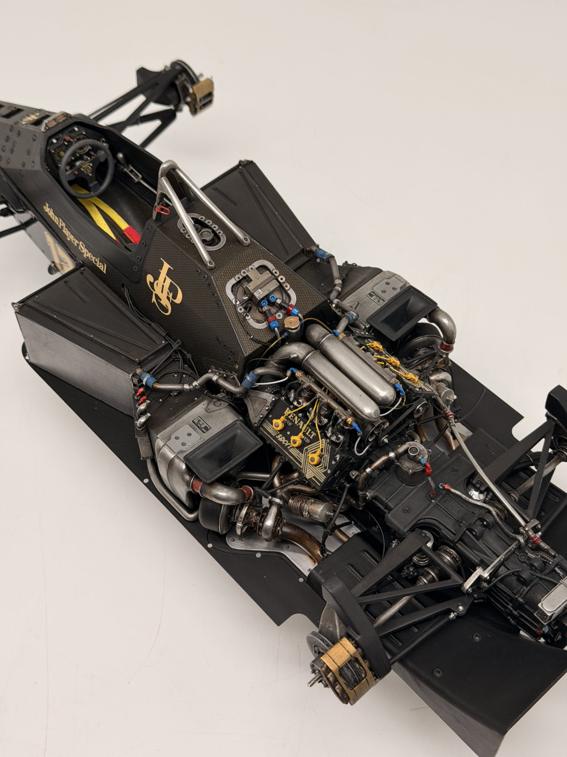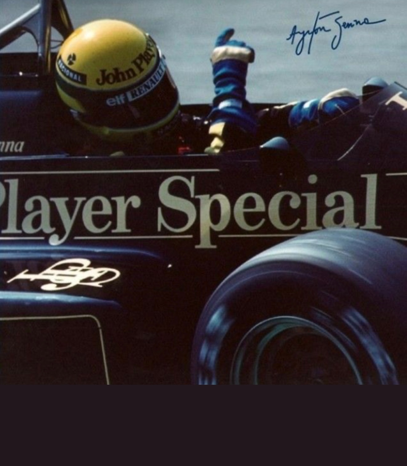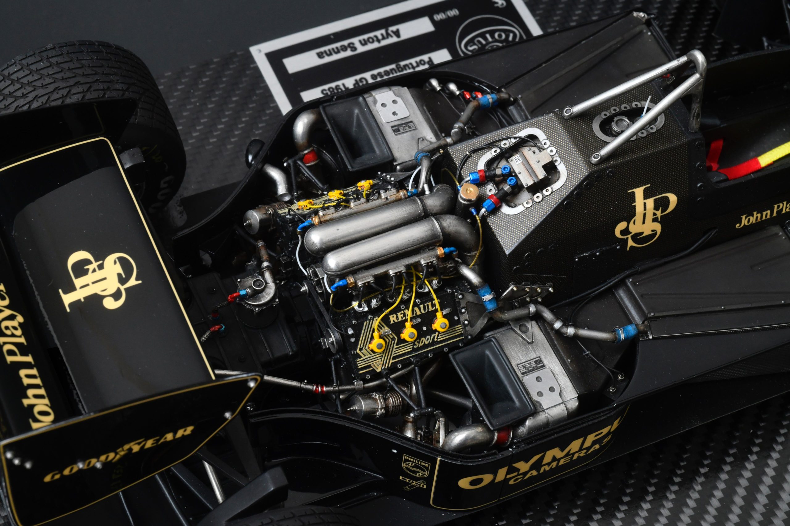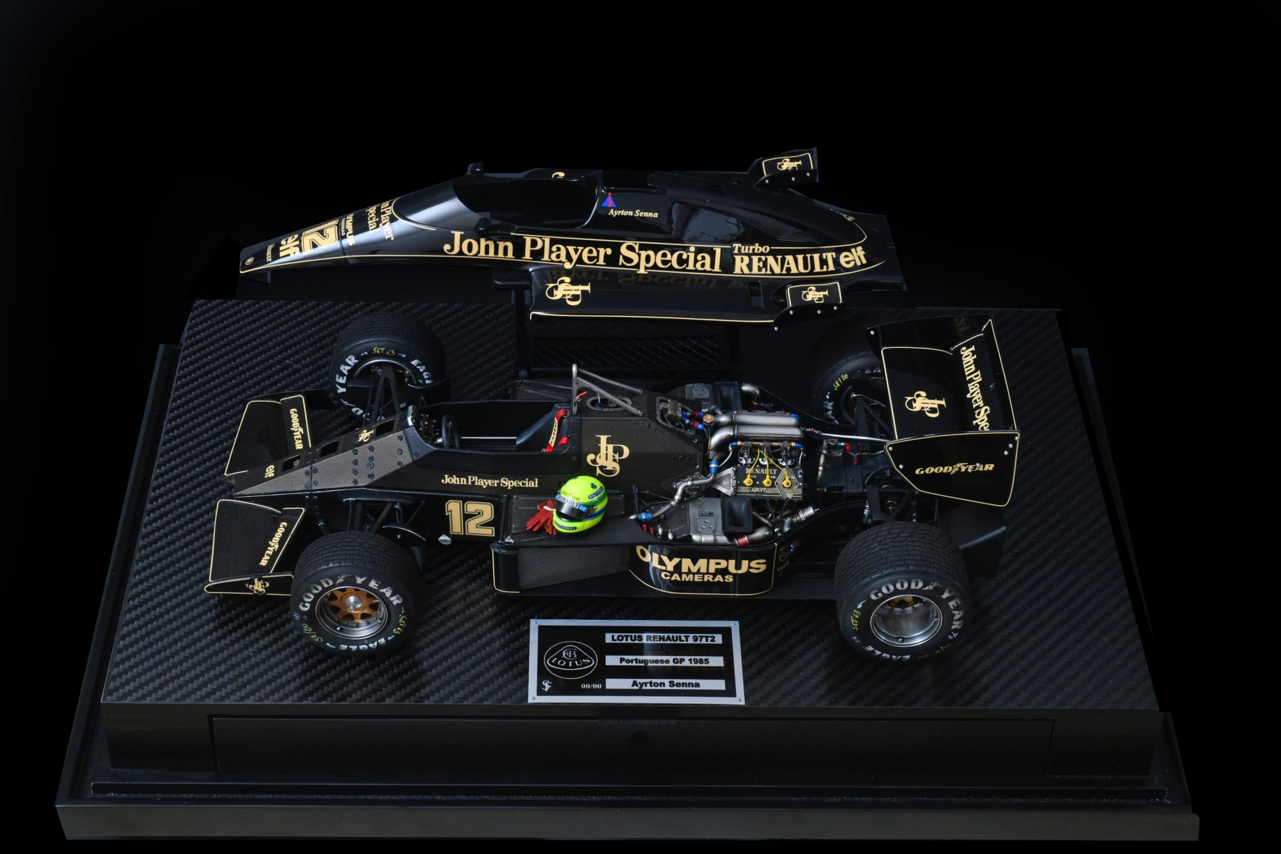 The 1985 season and is best remembered for delivering Ayrton Senna his first ever Grand Prix victory during a torrential downpour at the Portuguese Grand Prix in Estoril. This black and gold John Player Special liveried machine was powered by a 1.5 liter turbocharged Renault V6 engine that produced over 800 horsepower and featured innovative aerodynamic elements like mini winglets on the sidepods to improve stability and downforce. During the historic 1985 Portuguese Grand Prix Senna started from his maiden pole position and demonstrated unparalleled mastery in the wet conditions by leading every single lap and finishing more than a minute ahead of second place Michele Alboreto while lapping nearly the entire field. The car was widely considered to have the best handling chassis of the season due to its exceptional braking and turning capabilities which allowed Senna to maintain a dominant pace even as other top drivers spun out of the race. This victory at Estoril remains one of the most iconic performances in motorsport history and marked the true arrival of Ayrton Senna as a global sporting icon and the undisputed master of wet weather driving.
