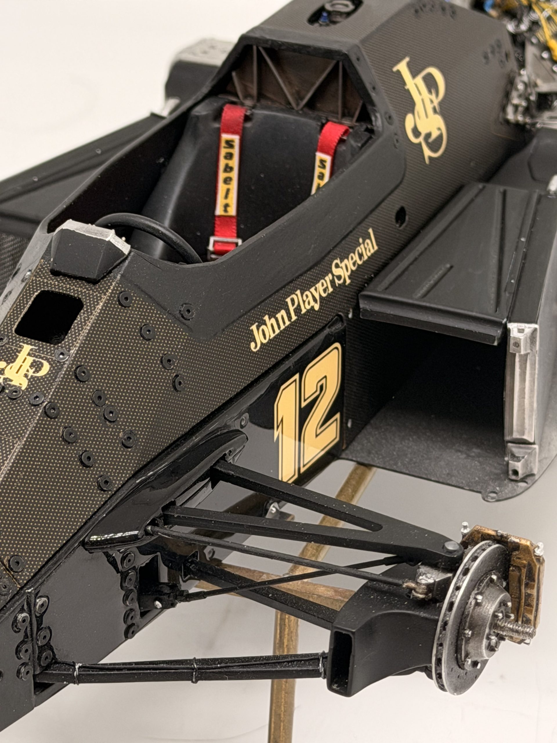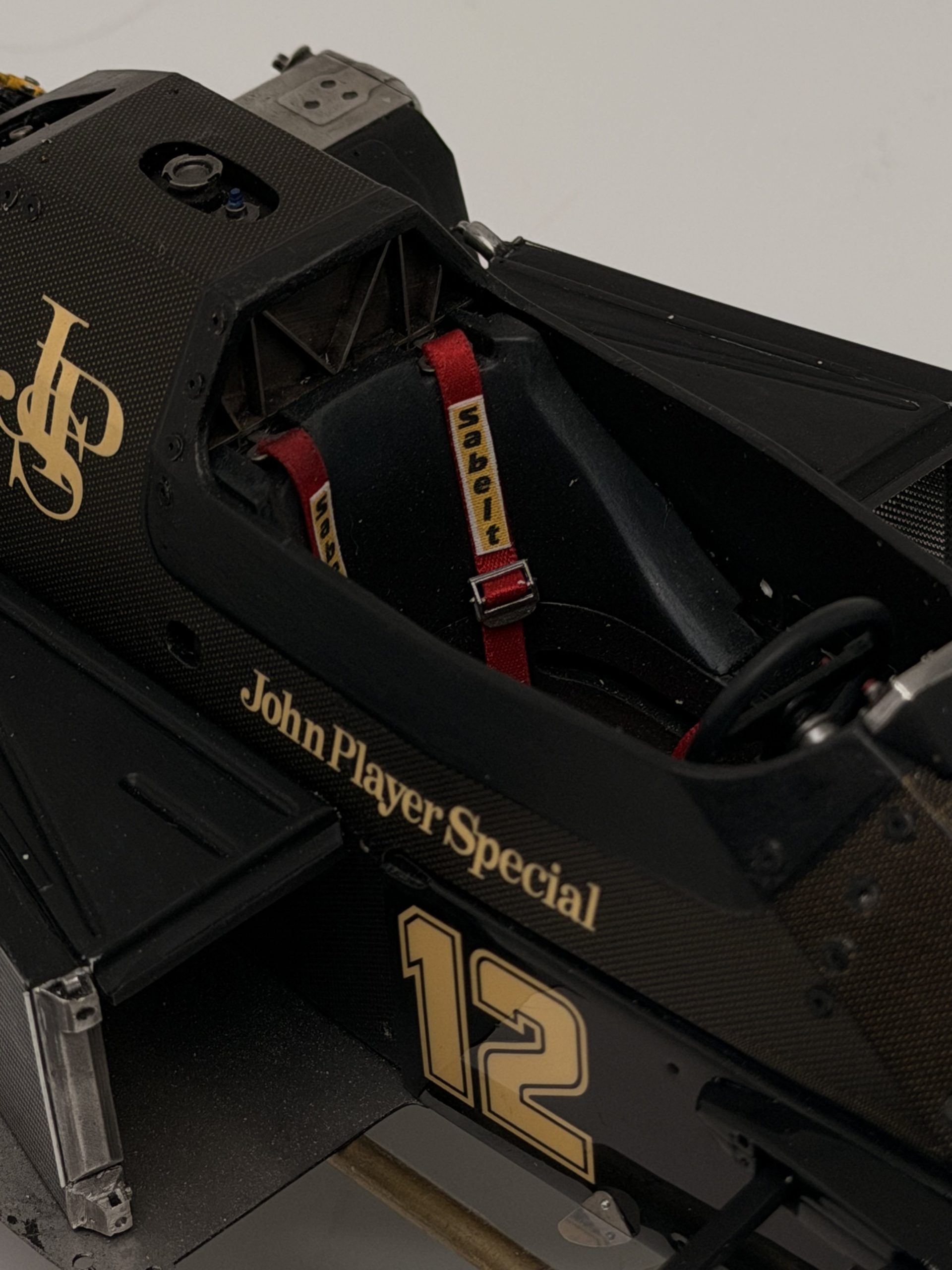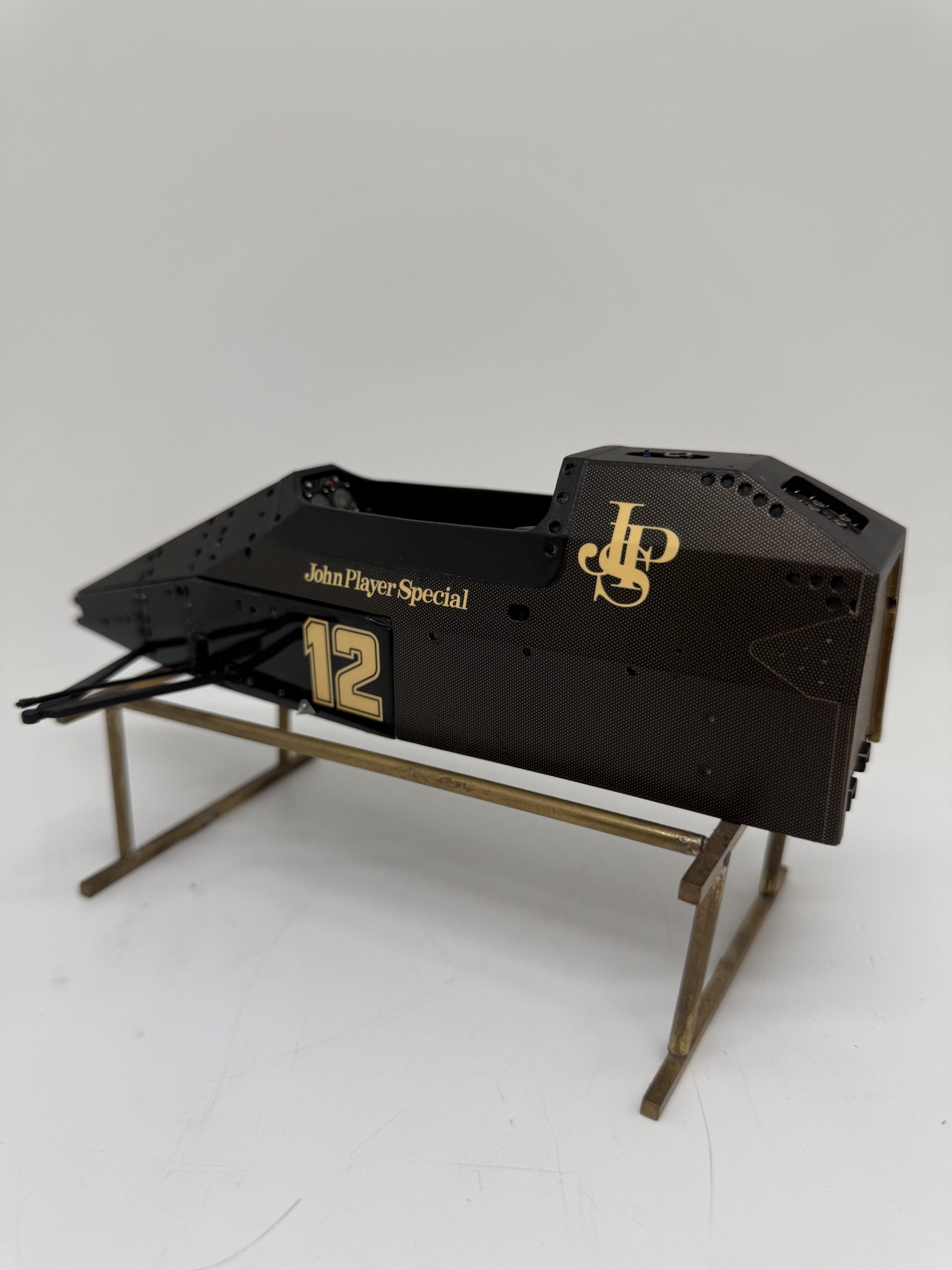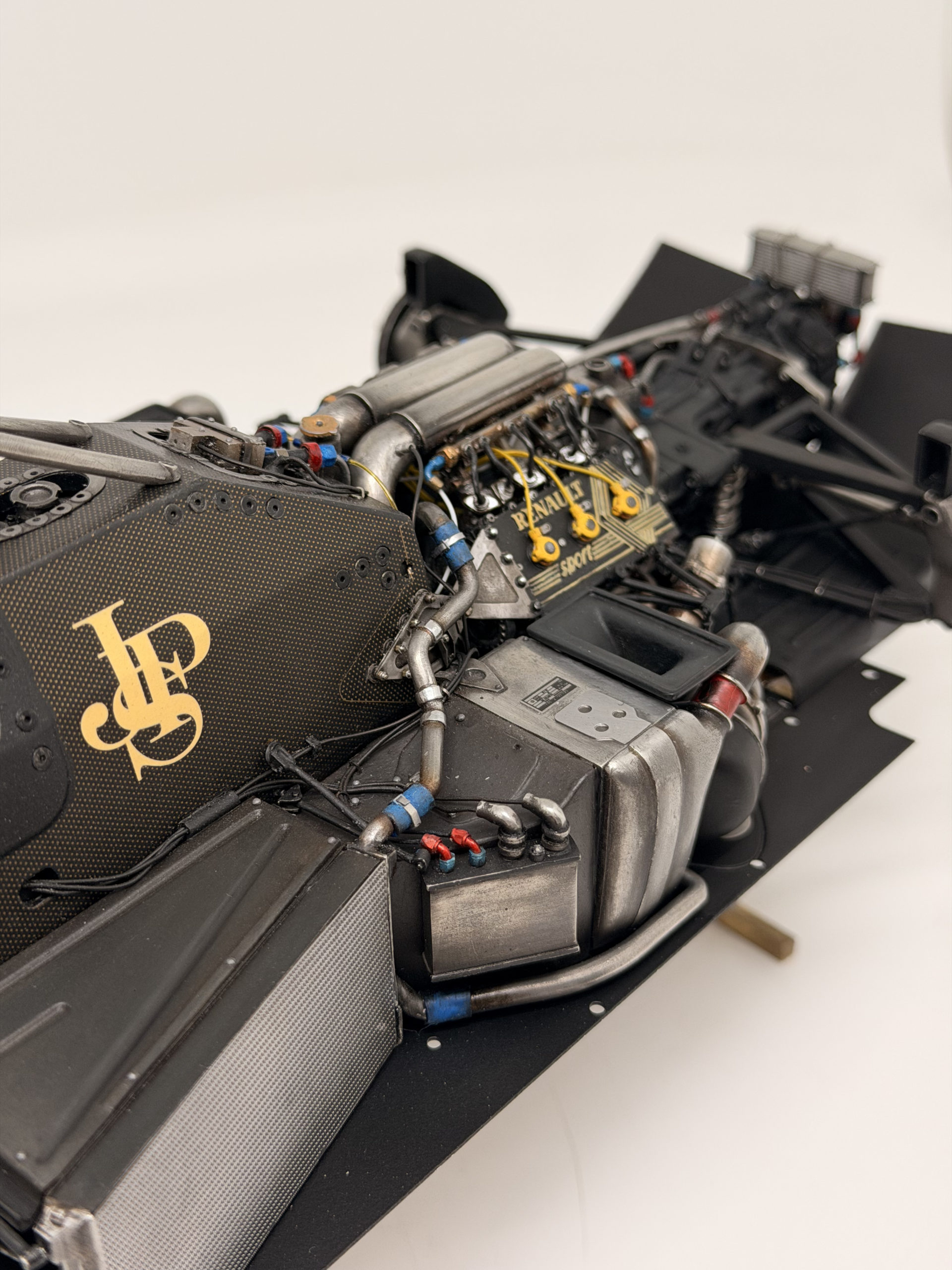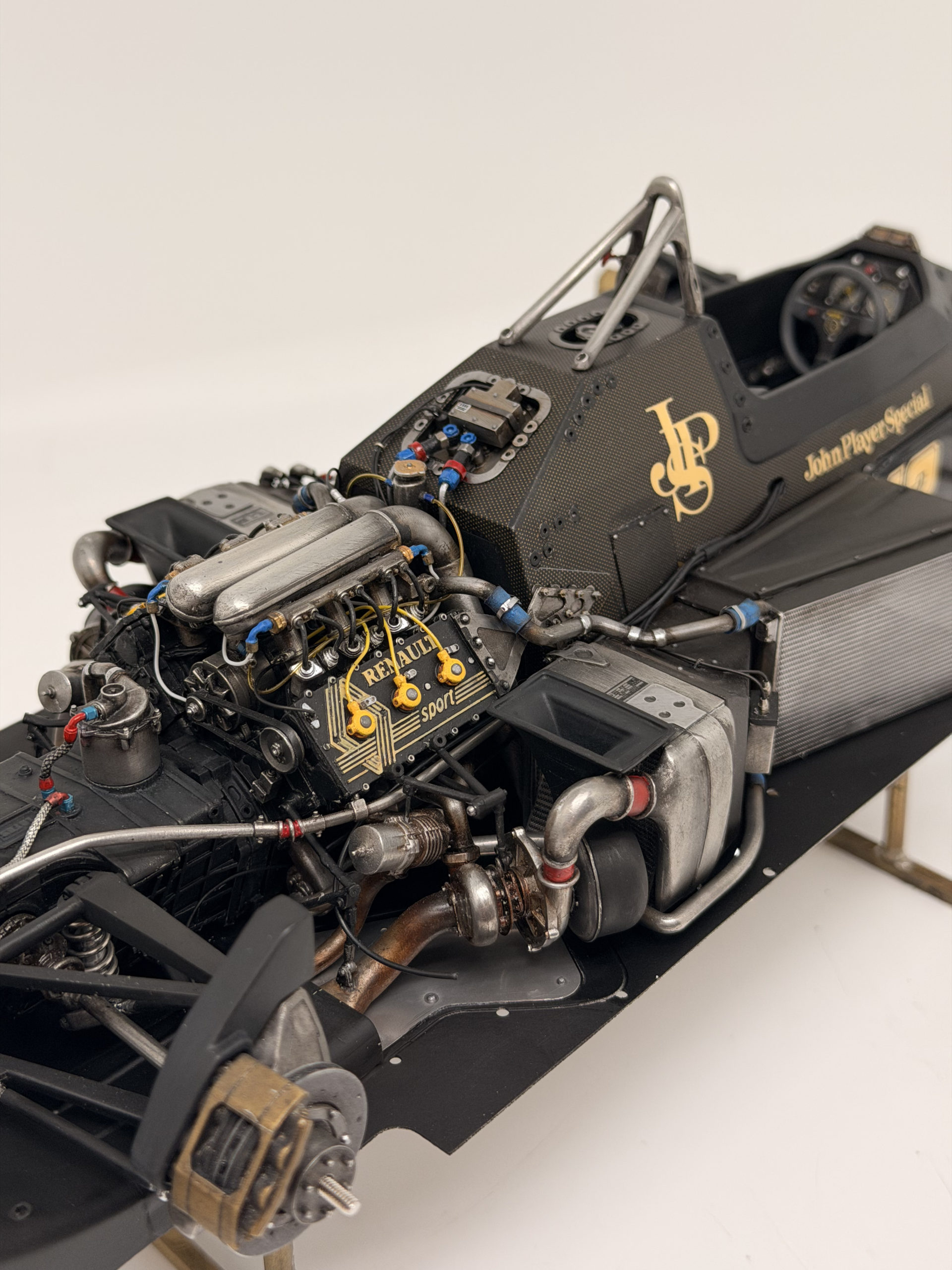 The 1985 season and is best remembered for delivering Ayrton Senna his first ever Grand Prix victory during a torrential downpour at the Portuguese Grand Prix in Estoril. This black and gold John Player Special liveried machine was powered by a 1.5 liter turbocharged Renault V6 engine that produced over 800 horsepower and featured innovative aerodynamic elements like mini winglets on the sidepods to improve stability and downforce. During the historic 1985 Portuguese Grand Prix Senna started from his maiden pole position and demonstrated unparalleled mastery in the wet conditions by leading every single lap and finishing more than a minute ahead of second place Michele Alboreto while lapping nearly the entire field. The car was widely considered to have the best handling chassis of the season due to its exceptional braking and turning capabilities which allowed Senna to maintain a dominant pace even as other top drivers spun out of the race. This victory at Estoril remains one of the most iconic performances in motorsport history and marked the true arrival of Ayrton Senna as a global sporting icon and the undisputed master of wet weather driving.