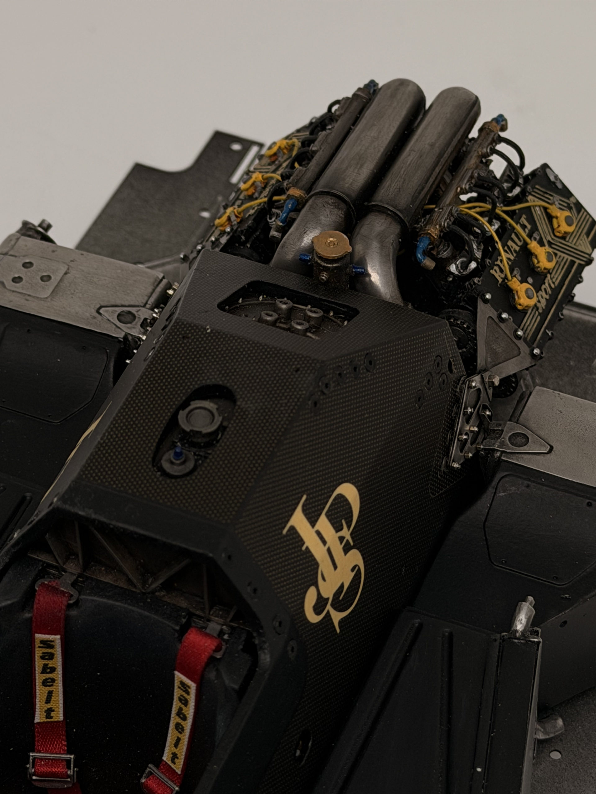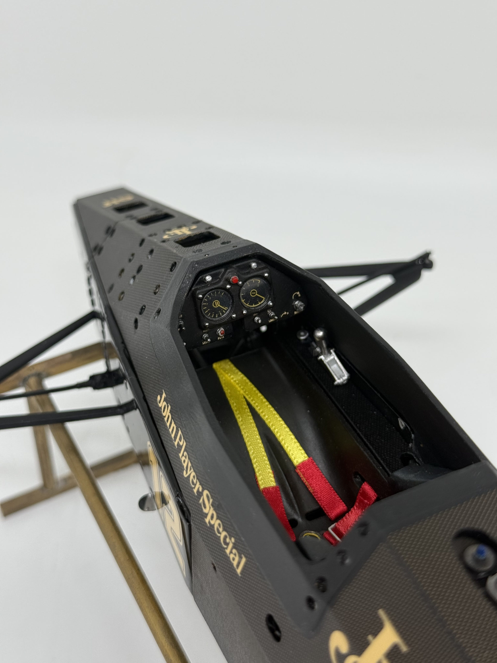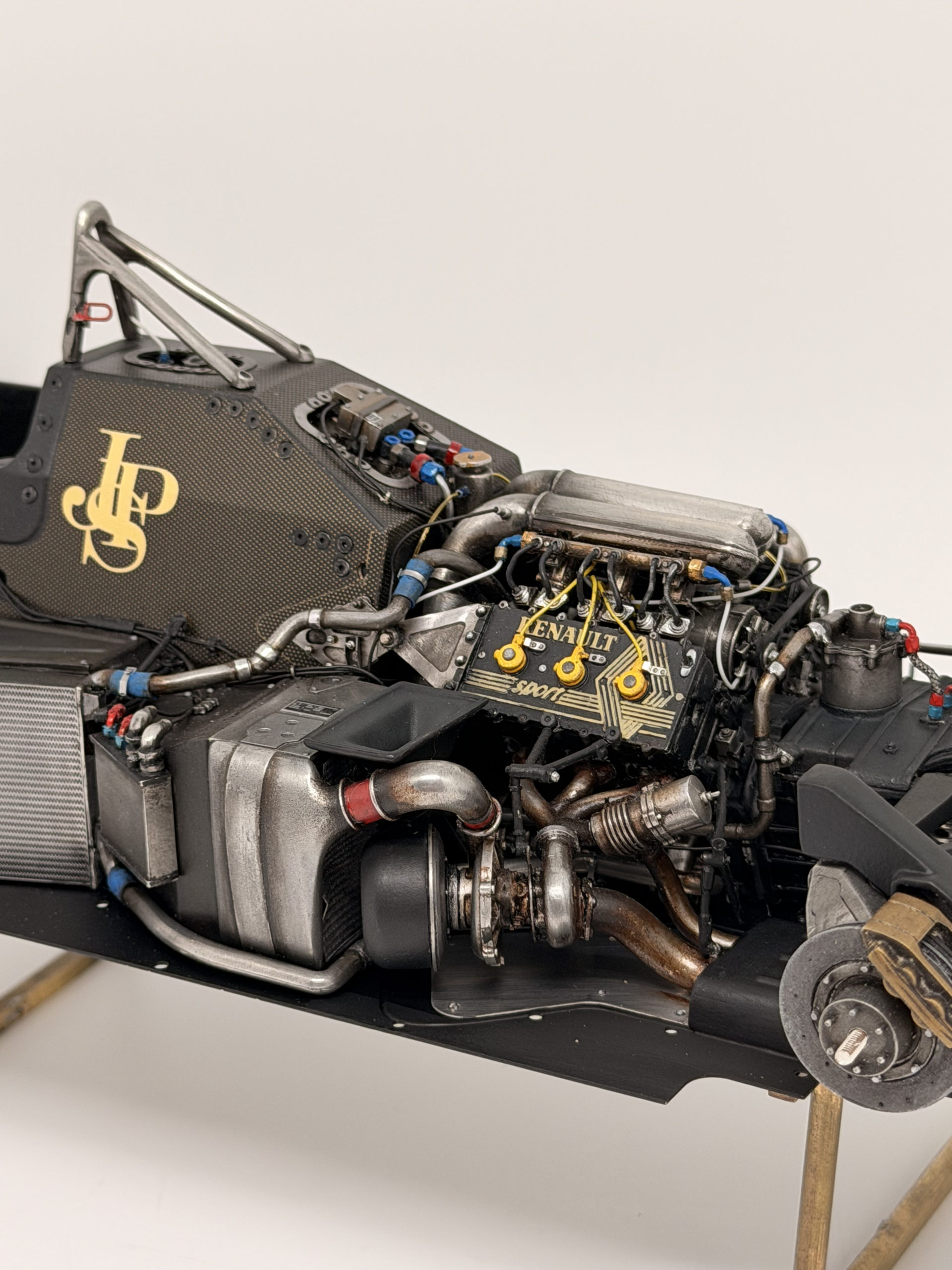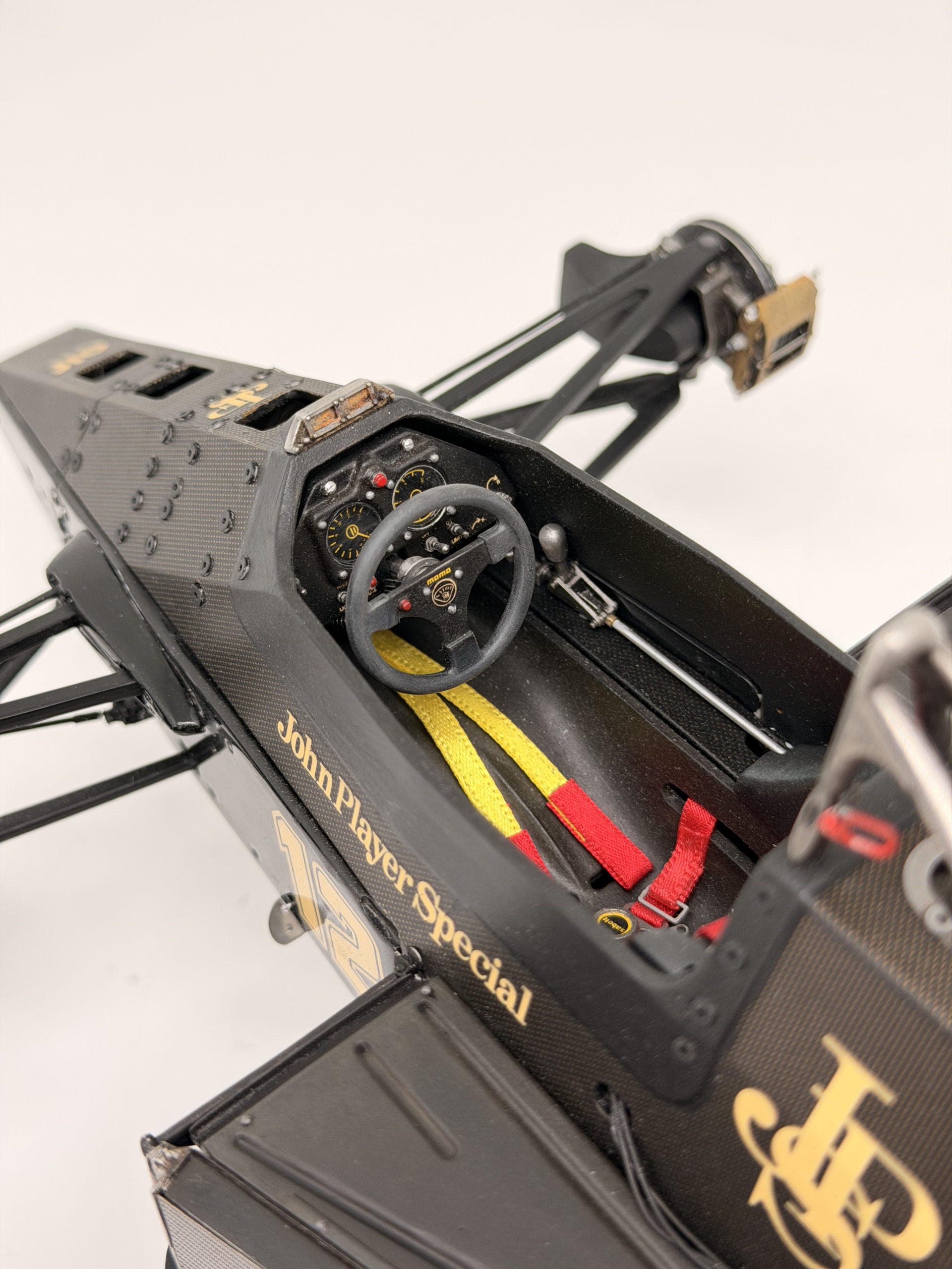 The 1985 season and is best remembered for delivering Ayrton Senna his first ever Grand Prix victory during a torrential downpour at the Portuguese Grand Prix in Estoril. This black and gold John Player Special liveried machine was powered by a 1.5 liter turbocharged Renault V6 engine that produced over 800 horsepower and featured innovative aerodynamic elements like mini winglets on the sidepods to improve stability and downforce. During the historic 1985 Portuguese Grand Prix Senna started from his maiden pole position and demonstrated unparalleled mastery in the wet conditions by leading every single lap and finishing more than a minute ahead of second place Michele Alboreto while lapping nearly the entire field. The car was widely considered to have the best handling chassis of the season due to its exceptional braking and turning capabilities which allowed Senna to maintain a dominant pace even as other top drivers spun out of the race. This victory at Estoril remains one of the most iconic performances in motorsport history and marked the true arrival of Ayrton Senna as a global sporting icon and the undisputed master of wet weather driving.